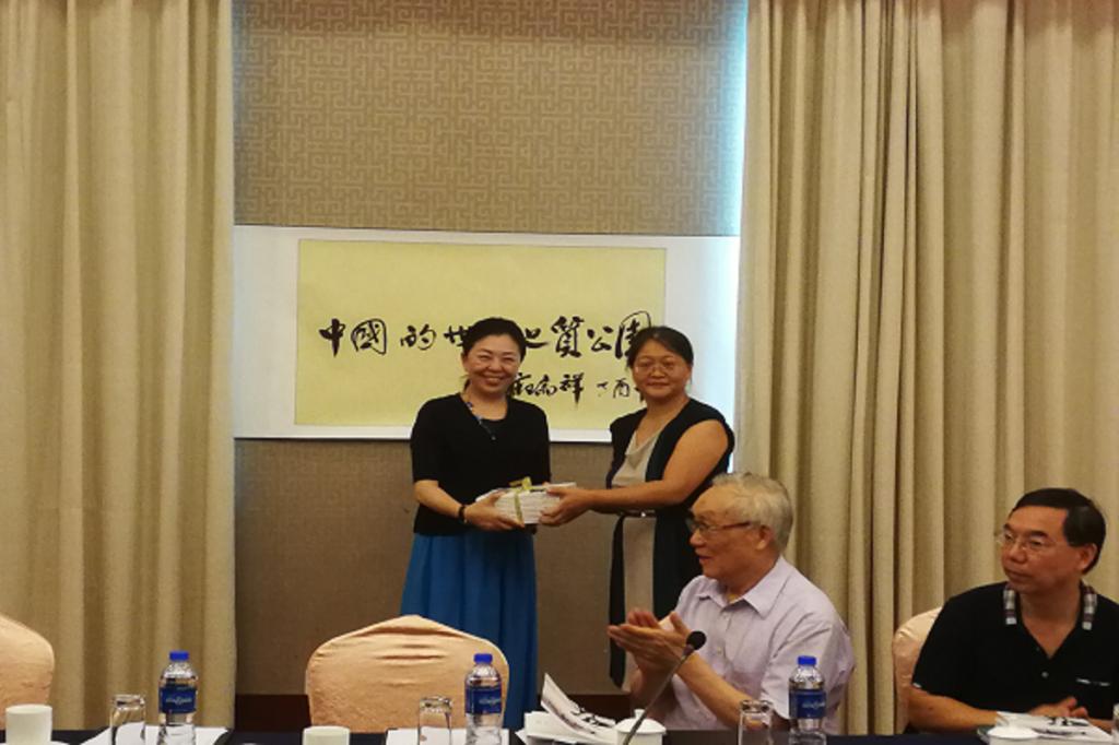 中国地质科学院信息中心副主任胡光晓向三十五中王红军副校长赠送《中国的世界地质公园》画册