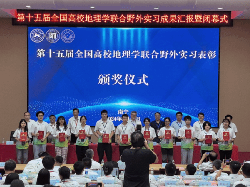 随后进行表彰环节。南宁师范大学教务处处长覃城阜教授宣读《关于表彰2024年第十五届全国高校地理学联合野外实习卓越实习生、优秀实习生、优秀指导教师的决定》。在热烈的掌声中,主席台上就座的嘉宾与领导们为荣获“卓越实习生”称号的同学们颁发了荣誉证书。经实习小组推荐和综合评估,英国正版365官网吴玉琳同学表现优异,荣获“卓越实习生”称号。