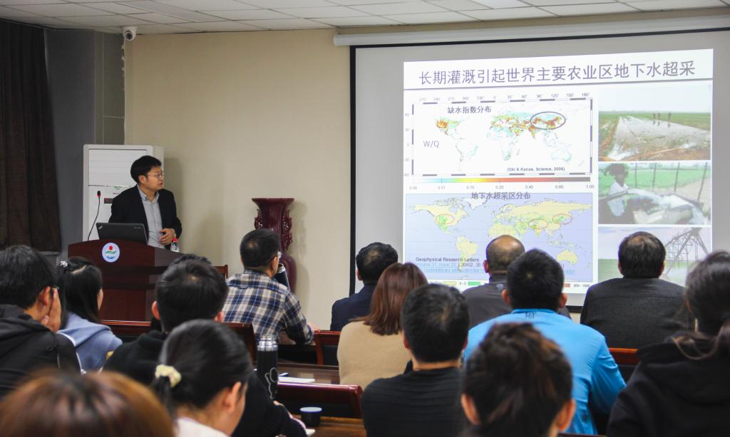 报告会上,沈彦俊结合多年对农业水文学与水资源的研究经验,以长期水平衡观测、农业可持续发展作为依据,围绕华北平原水资源演变及可持续管理的主题,从华北平原缺水问题及背景、华北平原水资源演变趋势、农业节水与水资源可持续利用研究三个方面,向与会者做了详细的报告。他首先从全球角度分析了灌溉农业的重要性,进而引出灌溉区地下水超采问题,以及过量开采水资源会引发严重生态问题。他用准确的数据、直观的图像展现了华北平原的水资源趋势、适水规模和种植模式等,并且就地下水资源利用效率低、地下水资源开采过度导致地表生态环境恶化等问题阐明了自己的看法:维持农业水资源高效可持续利用是解决缺水问题的钥匙。最后,他建议在全面总结当前科研进展的基础上,要注重理论和实践结合,构建分布式模型,结合遥感技术进行多尺度监测模拟,他还表示科研项目的进展与长期研究提供的理论依据密切相关。