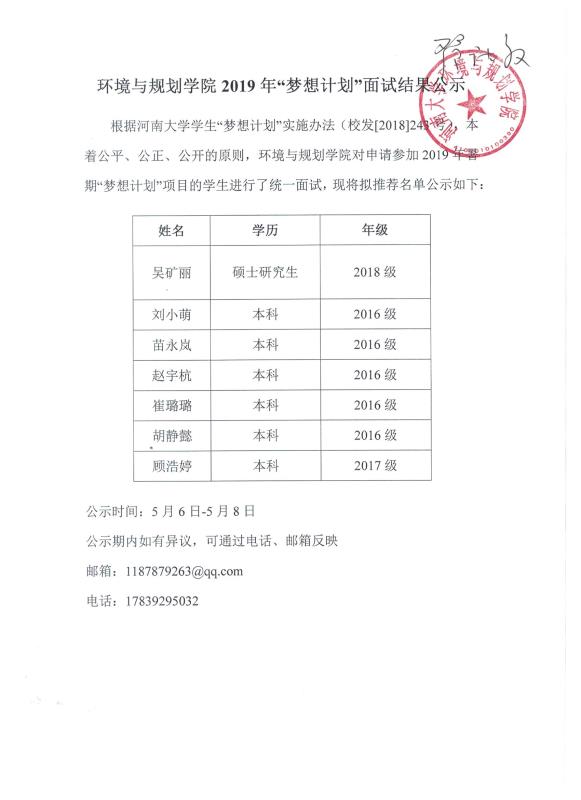 根据英国正版365官网学生“梦想计划”实施办法(校发[2018]243号),本着公平、公正、公开的原则,环境与规划学院对申请参加2019年暑期“梦想计划”项目的学生进行了统一面试,现将拟推荐名单公示如下